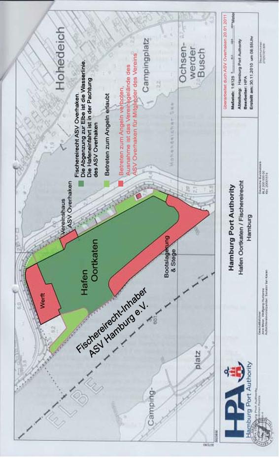 Obere Grenze der Pachtung ist die Hamburger Landesgrenze bei Flußkilometer 588. Untere Grenze ist die 7. Buhne vor Beginn der angelegten Priele/Teiche. Hier darf nur elbaufwärts geangelt werden. Bitte das Naturschutzgebiet beachten. Diese Strecke ist von mehreren Vereinen gepachtet. Am Pumpwerk darf nur das große Brack beangelt werden. Das kleine Brack ist nicht Bestandteil der Pachtung. Behördliche Hinweisschilder sind zu beachten. Achtung! Es gelten besondere Bestimmungen für das Zanderangeln. Näheres hierzu auf der Seite der obersten Fischereibehörde Hamburg!