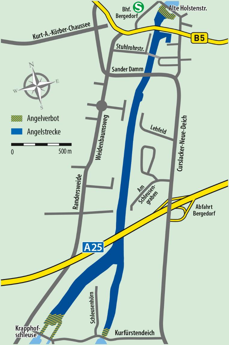 Obere Grenze unserer Pachtstrecke Bille ist die Landesgrenze / Marienburg. Abwärts endet die Pachtung oberhalb der Schleuse Alte Holstenstraße. Die Strecke von der Bootsvermietung (Chrysanderstraße) abwärts bis zur Schleuse Alte Holstenstraße darf nur vom Boot beangelt werden.